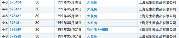 大白兔”奶糖商標所有者上海冠生園注冊的部分防御性商標。本文圖片來源:國家工商行政管理總局商標局網(wǎng)站