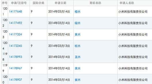 小米科技有限責任公司注冊了“大米”、“藍米”、“黑米”、“紫米”、“橙米”、“綠米”、“黃米”、“桔米”等商標。