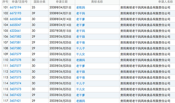 和阿里巴巴類似,公眾熟知的油制辣椒品牌“老干媽”所有者貴陽南明老干媽風(fēng)味食品有限責任公司,還注冊了“老干爹”、“老干娘”、“老干爸”、“干兒子”、“干兒女”、“老姨媽”等商標。