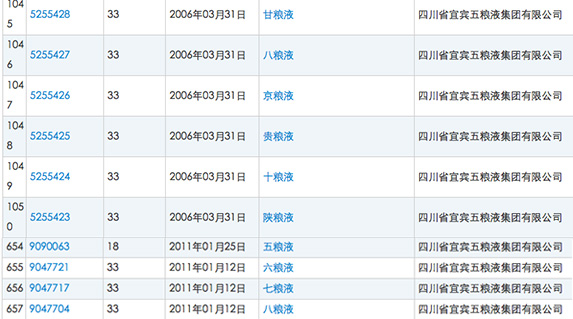 截至發(fā)稿,在國家工商總局商標局的商標綜合查詢系統(tǒng)里,可以查到四川省宜賓五糧液集團有限公司共計持有2064個商標,除了眾人所知的“五糧液”,該公司還注冊了“六糧液”、“七糧液”、“八糧液”等。在商標國際分類“33”類之下,該公司還注冊了“五糧液酒圣”、“五糧液安樂泉”、“五糧液奮進塔”、“五糧液誠信碑”、“五糧液芝麻開花節(jié)節(jié)高”、“五糧液參天大樹”等商標。此外,該公司還注冊了以各省簡稱為前綴的“五糧液”變種,比如“甘糧液”、“京糧液”、“貴糧液”、“陜糧液”等。